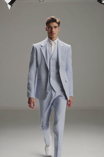Stay effortlessly cool and sharp with our Men's Seersucker Suit – a timeless blend of Southern charm and modern elegance. Crafted from breathable, puckered seersucker fabric in a light blue and white stripe pattern, this suit features a stylish two-layer design: a lightweight outer blazer and a matching inner vest or jacket. Perfect for warm-weather occasions like outdoor weddings, garden parties, or summer business events, this suit delivers both comfort and classic appeal. Finished with a crisp white shirt and a smart blue tie, it’s the ideal choice for the man who wants to stand out — without breaking a sweat.