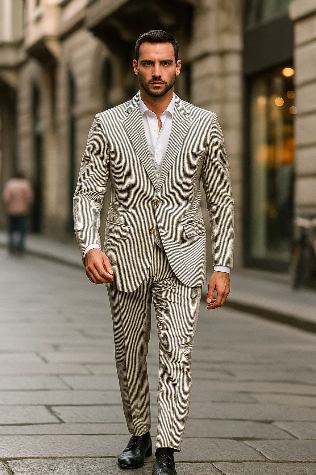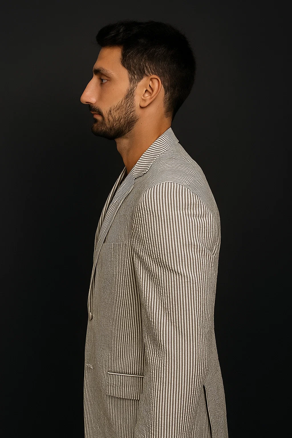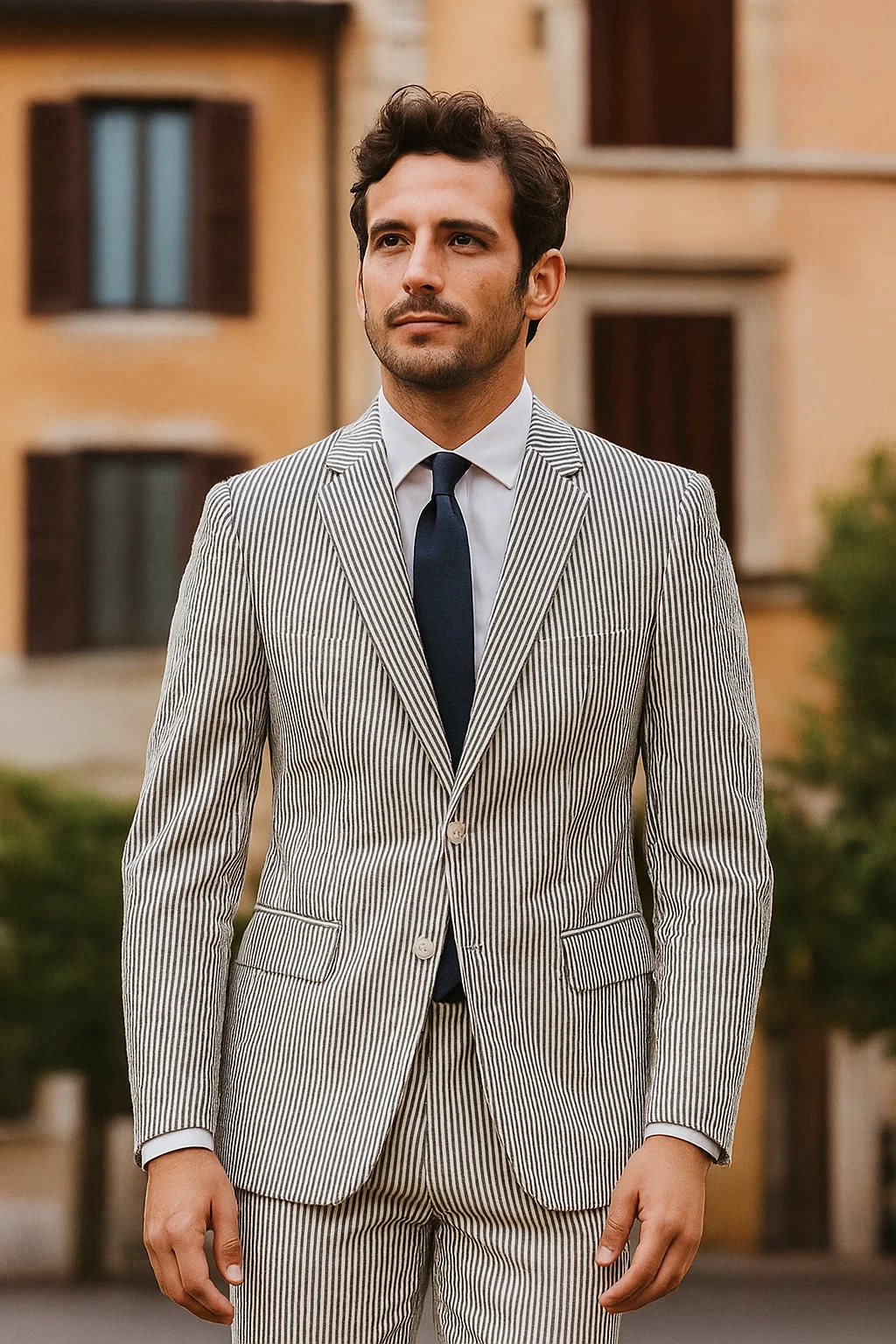 Whether you're attending a summer wedding, brunching on a patio, or heading to the office, this striped seersucker suit balances casual cool and refined style with ease.