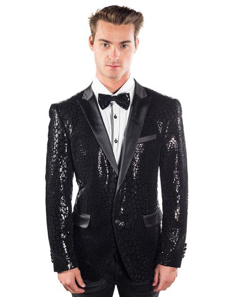 Sequin Blazer Mens Black 2 Buttons Sequined Reptilian Print Blazer Matching Bow Tie
