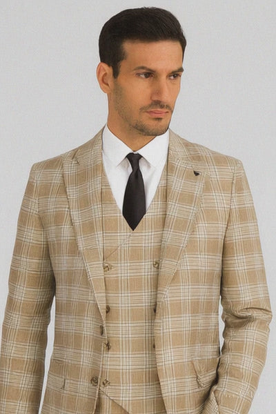 The standout feature of this suit is its beige plaid fabric, a subtle yet stylish pattern that offers a refreshing alternative to plain suits. The plaid design is bold enough to make a statement but neutral enough to remain versatile, giving you endless styling possibilities. This beige shade is sophisticated and modern, making it easy to pair with crisp white shirts, dark dress shirts, or even turtlenecks for a contemporary edge.