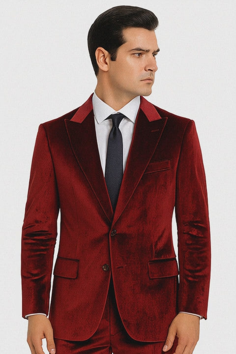 Tazzio Men’s Formal Burgundy Velvet Suit – Peak Lapel Slim Fit 2-Piece Outfit