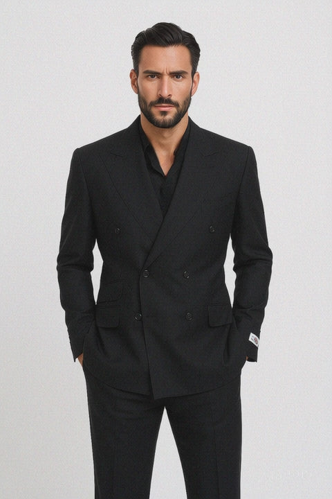 Tiglio Rosso Suit - Classic Fit Athletic Cut 100% Wool Super 150s Italian Fabric Peak Lapel in Color Dark Black