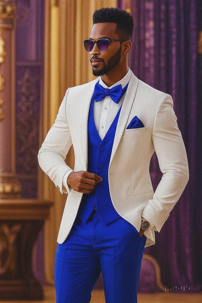 White and Royal Blue Tuxedo Wedding Suit - White Dinner Jacket + Vest + Pants + Bow-tie